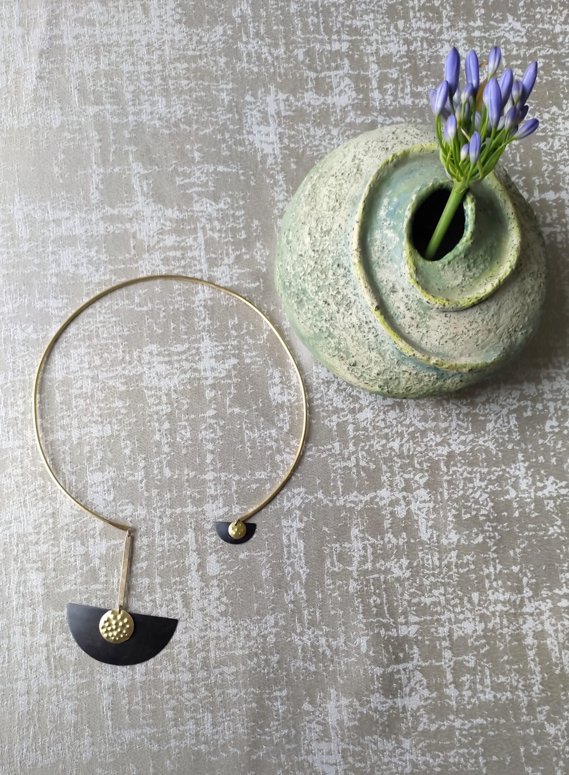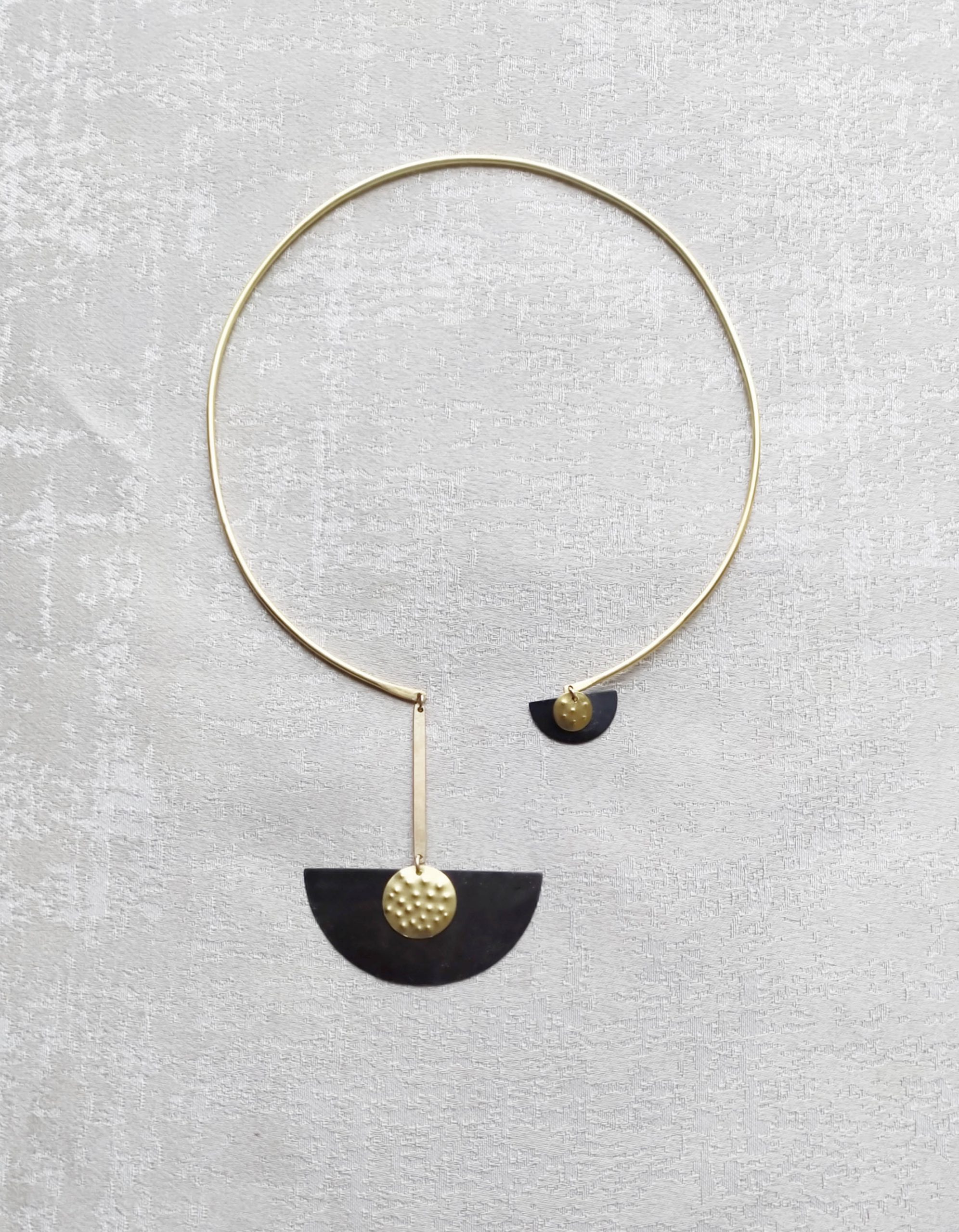 חישוק בציפוי זהב איכותי בעל שני אלמנטים של חצאי סהר עשויים פליז מושחר ומעוטרים בעדשות בציפוי זהב איכותי.