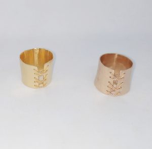 טבעות מחוך גולדפילד. שתי טבעות מעוצבות בדוגמת מחוך, אחת בצבע רוז' והשניה בגולדפילד צהוב. הטבעות שזורות בשרשרת גולדפילד. המחיר לטבעת בודדת.