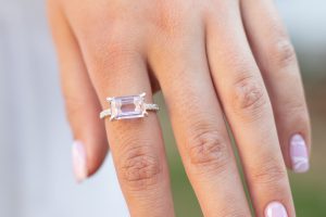 טבעת כסף 925 משובצת זרקונים, במרכזה אבן קריסטל קוורץ ורוד סינטטי מלבנית.