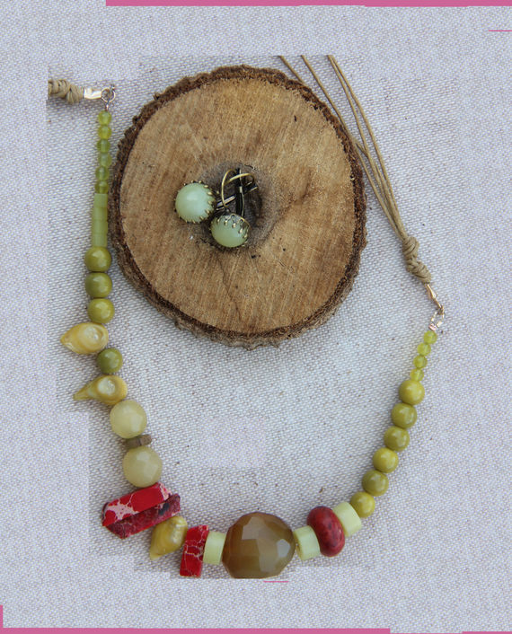 שרשרת עד קו החזה עם אבני קורל ופנינים ירוקות בשילוב עם אבני חן. זוג עגילים משובצים באבנים תואמות