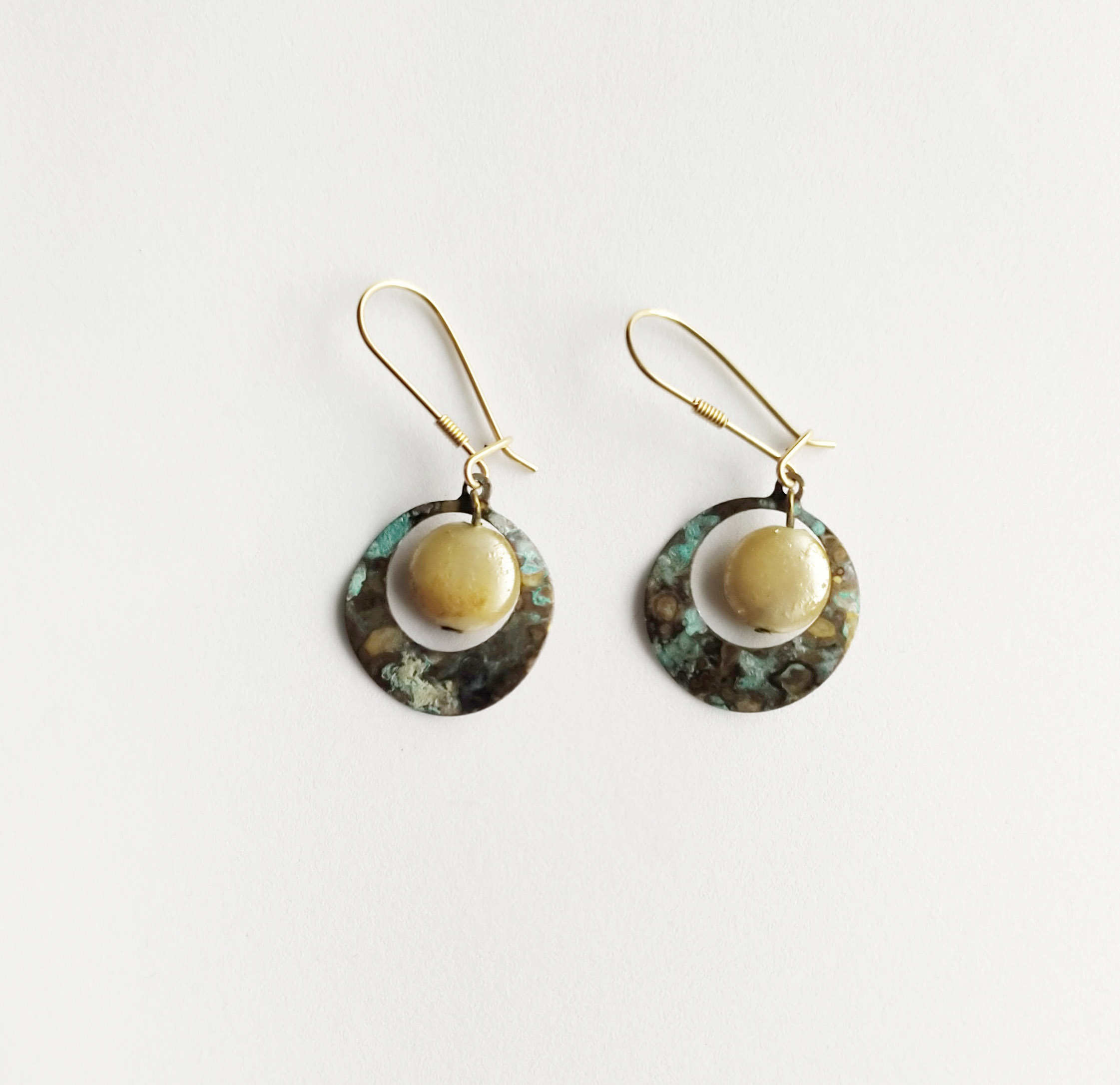 עגילי פליז בדמוי סהרונים. עגילים אלו עברו תהליכי צריבה בטכניקה יחודית המעניקים גוונים מיוחדים לעגיל, זהב וטורקיז. העגילים מעוטרים בפנינה ישנה המשלימה את המראה העתיק. מתלה העגיל עשוי גולדפילד.