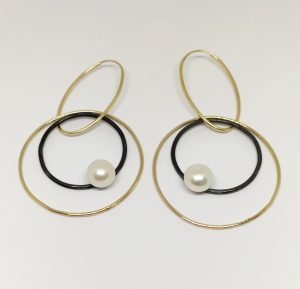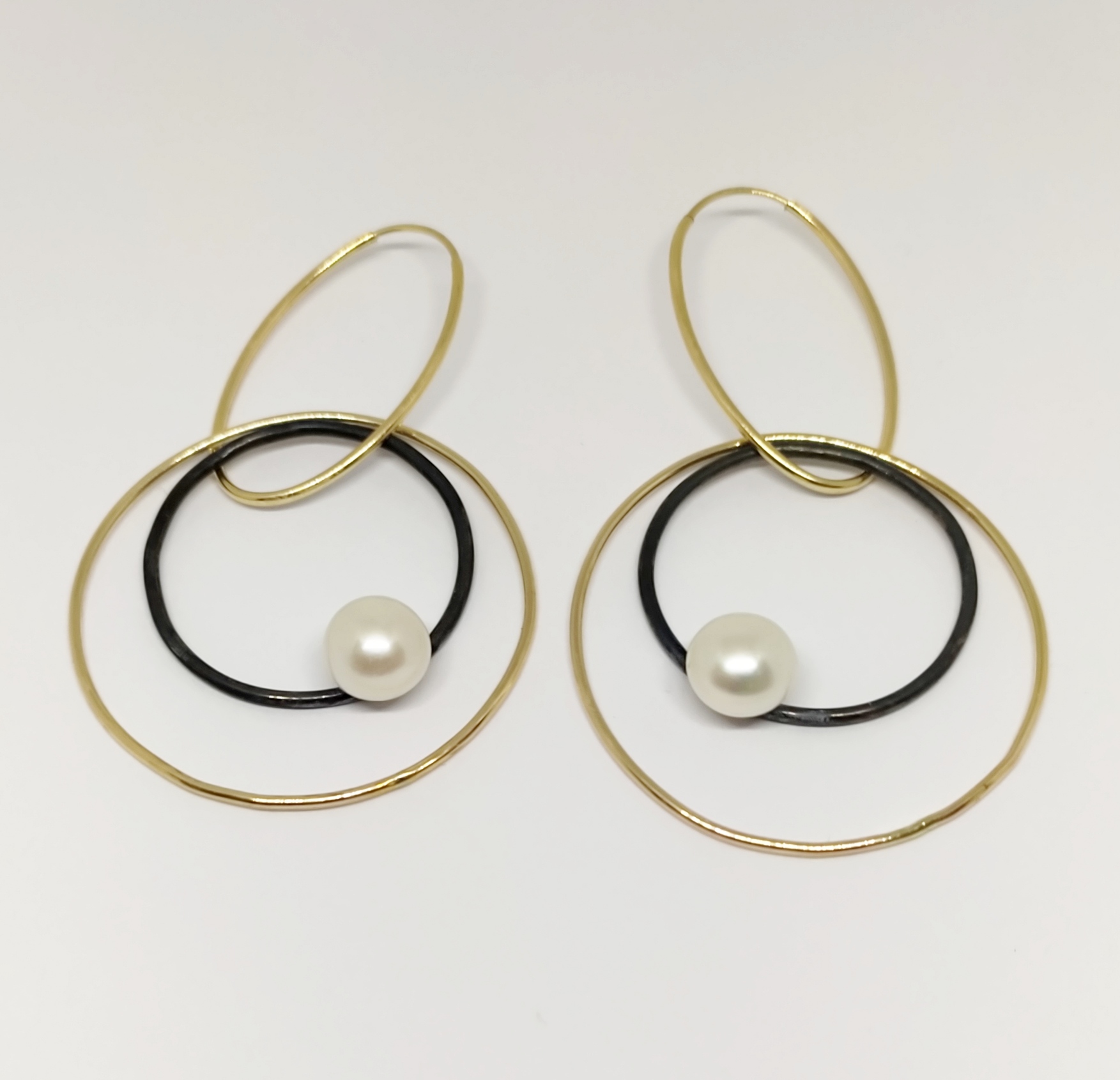 עגיל חישוקים מכסף וגולדפילד. העגיל בנוי מחישוק אובלי עשוי גולדפילד המחזיק בתוכו שני חישוקים. האחד גדול מגולדפילד והשני מכסף מושחר עם פנינה מובנית.