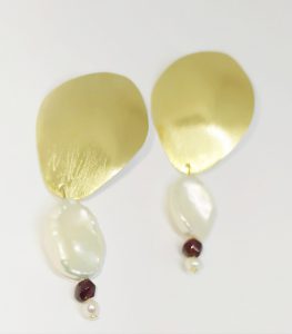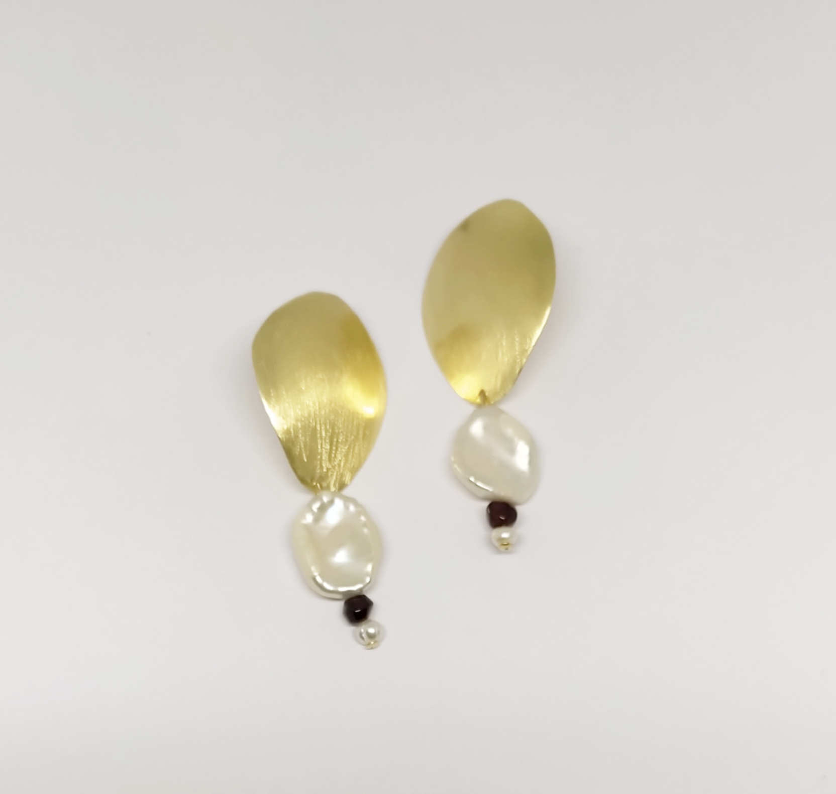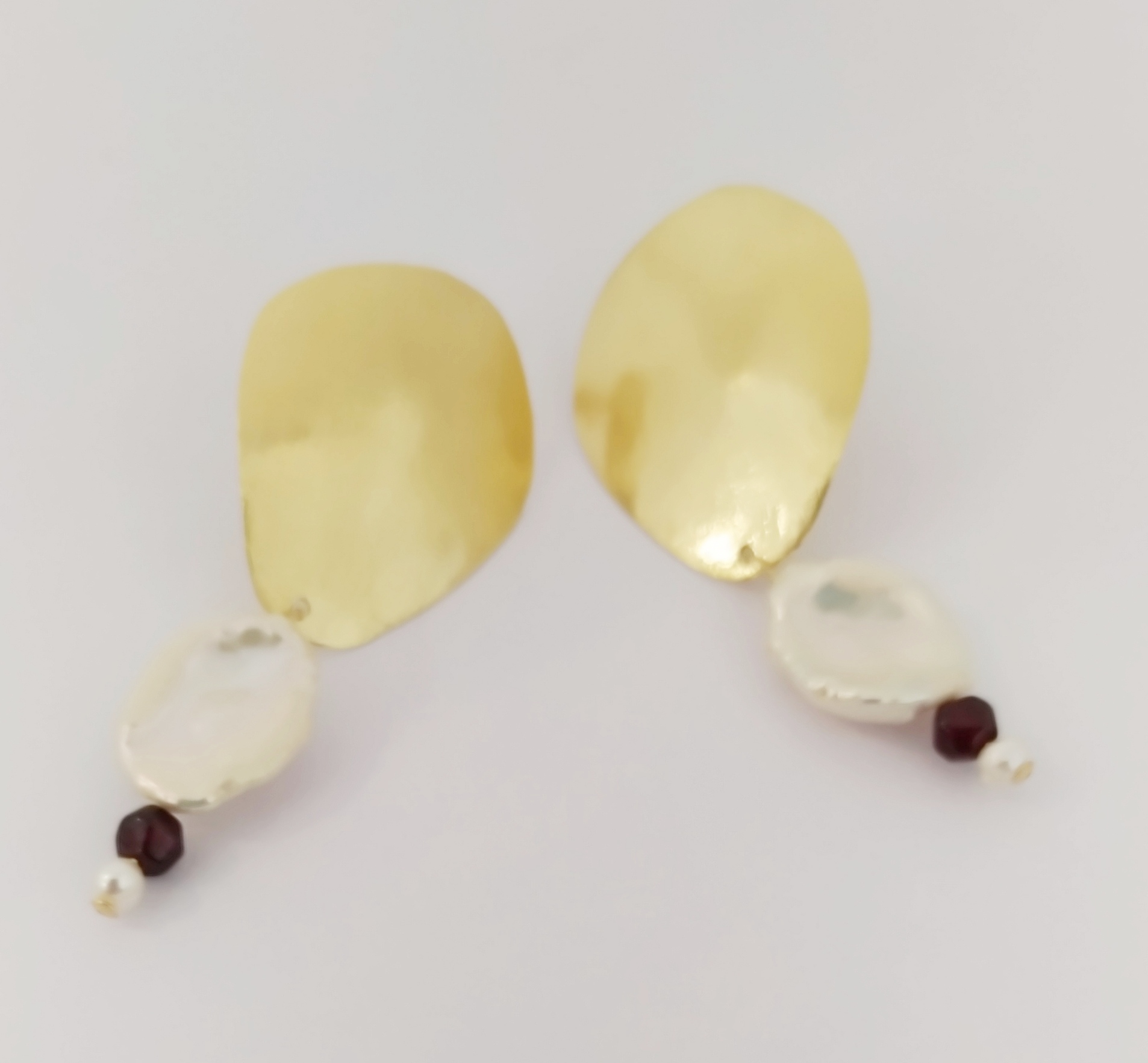 עגיל טיפה בציפוי זהב עם פנינה פראית ואבן גרנט. ציפוי הזהב באיכות גבוהה, 1.5U. צורת ענידה צמודה לאוזן.