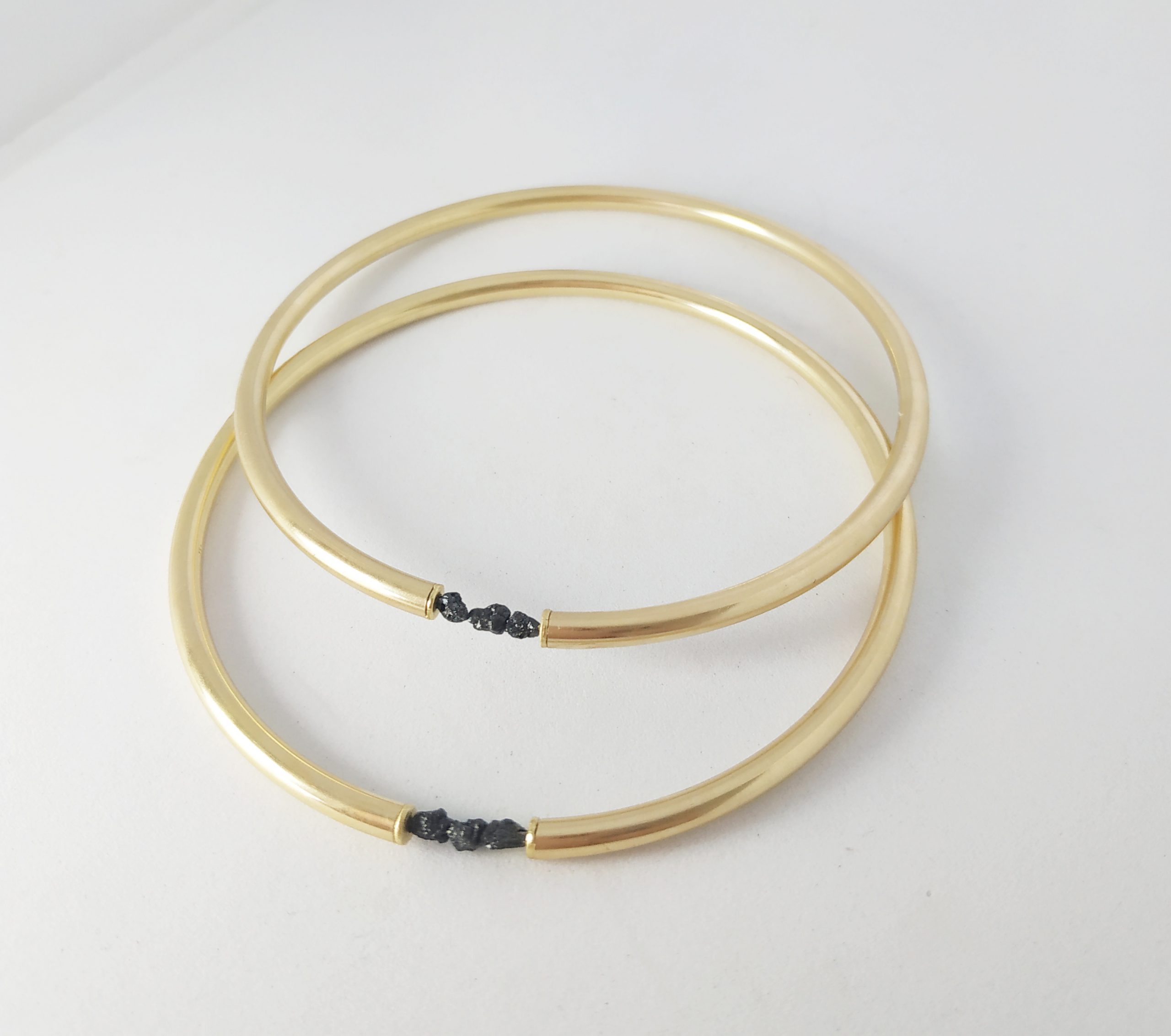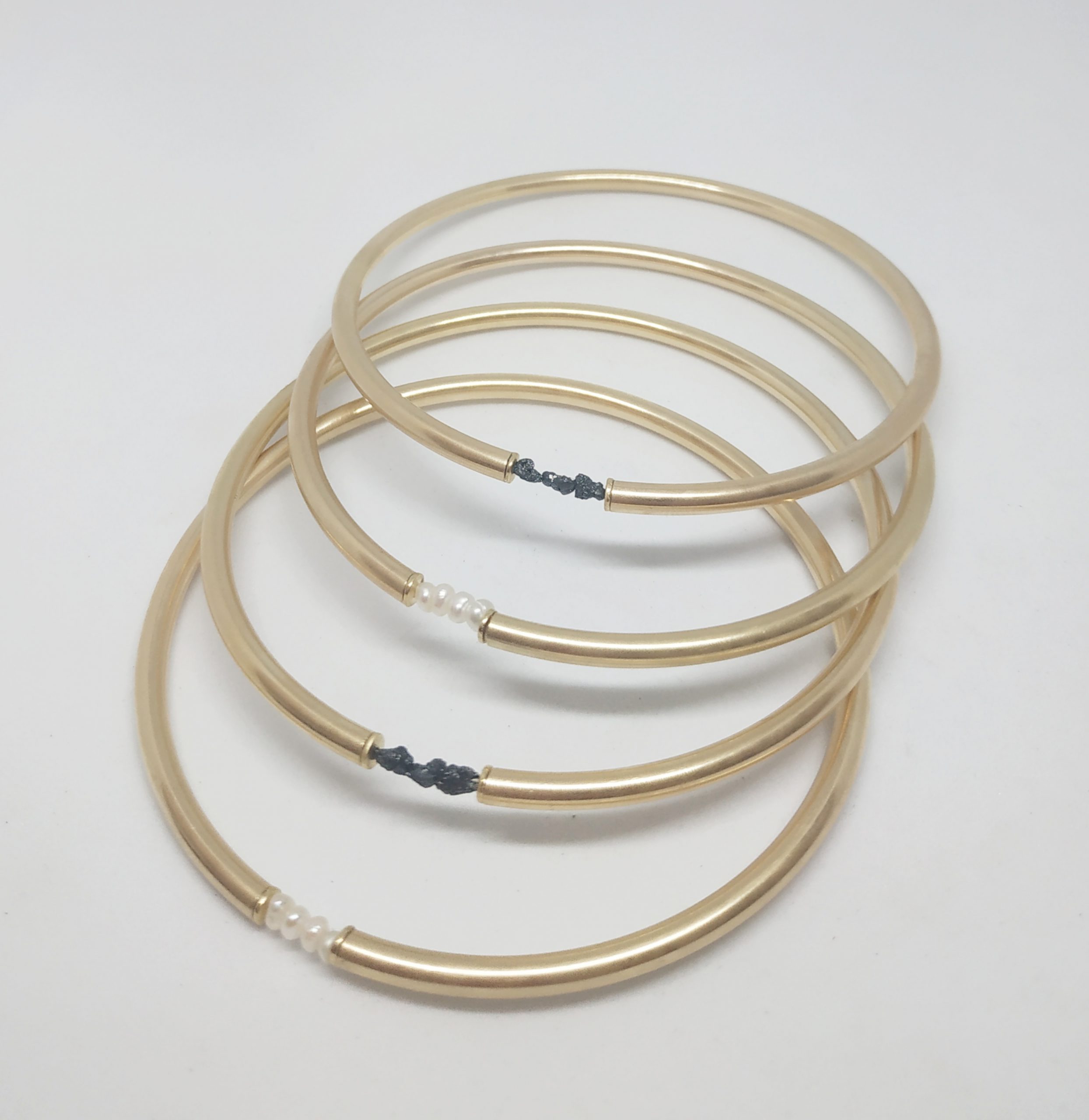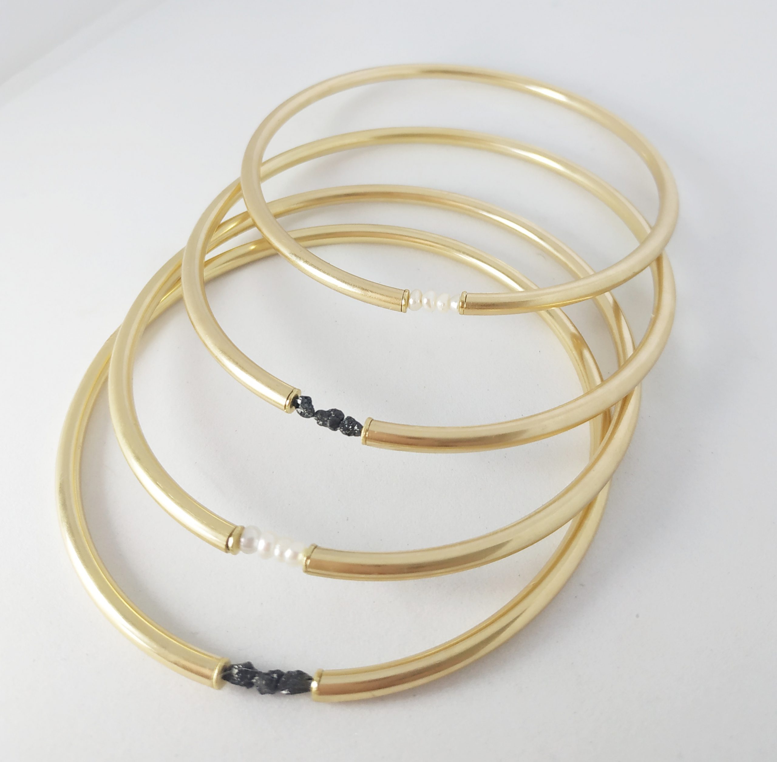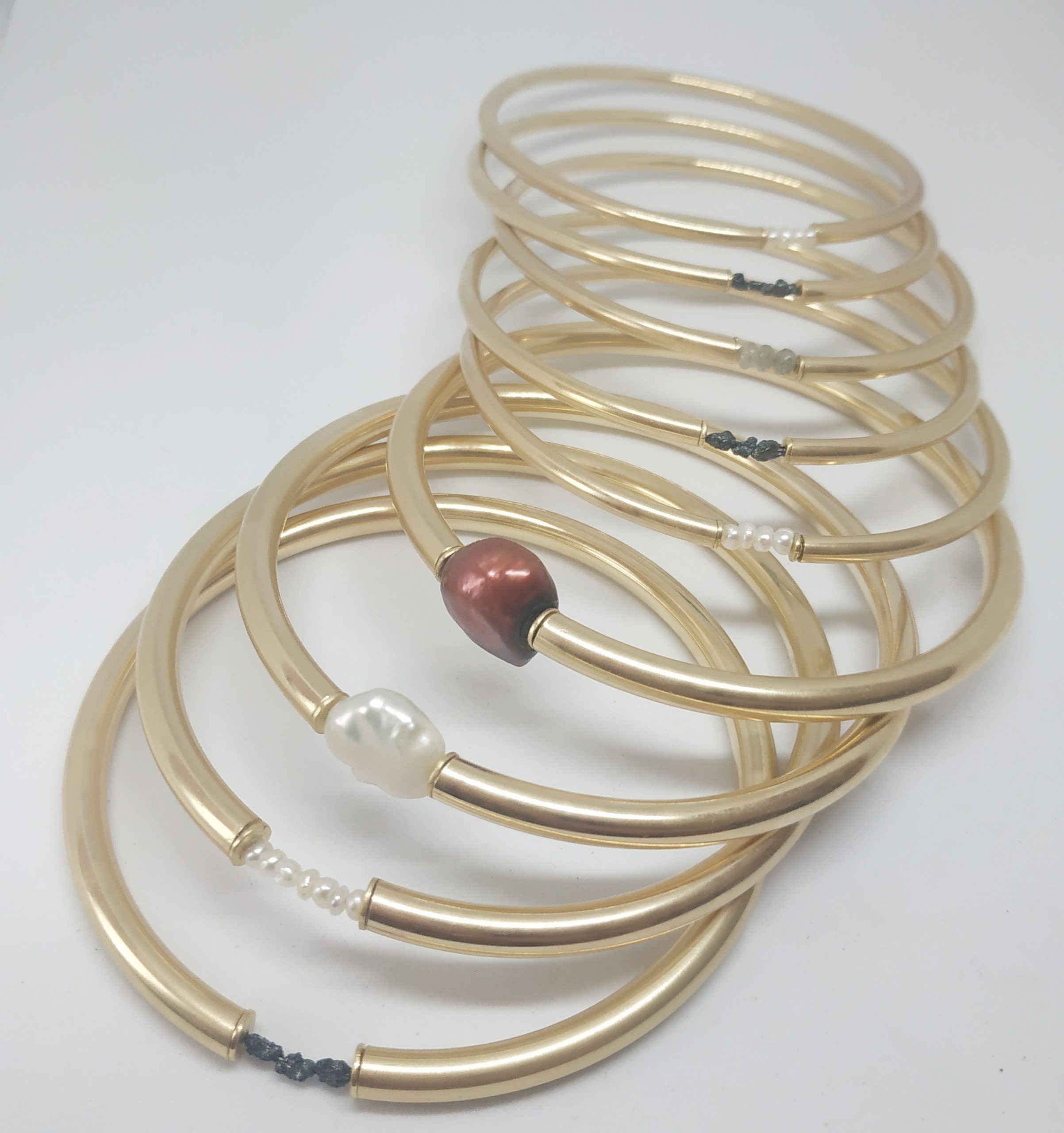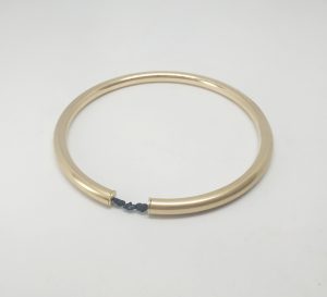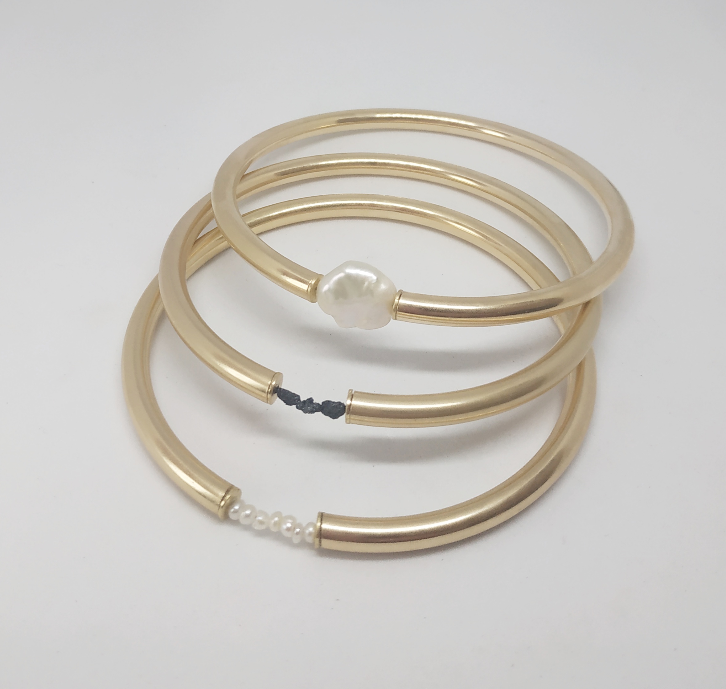 צמיד צינור מצופה זהב 18 קאראט, עם פנינה פראית בגוון שחור.