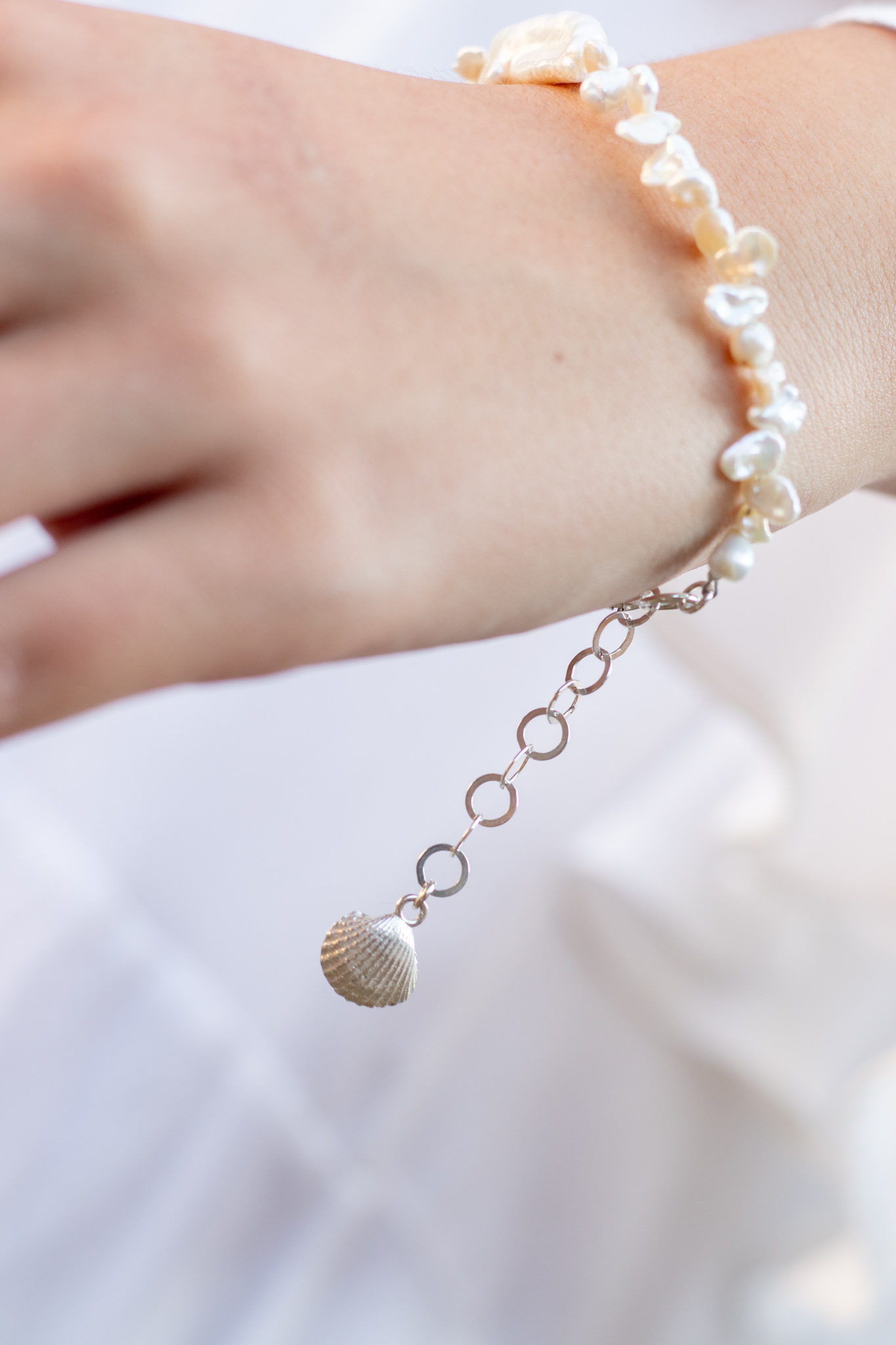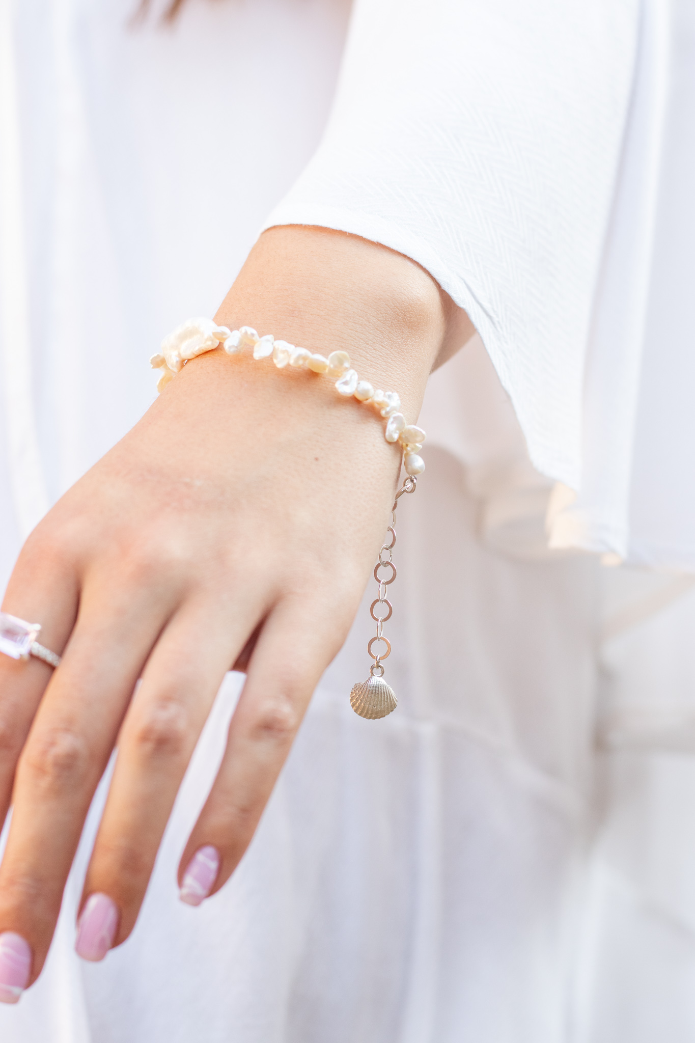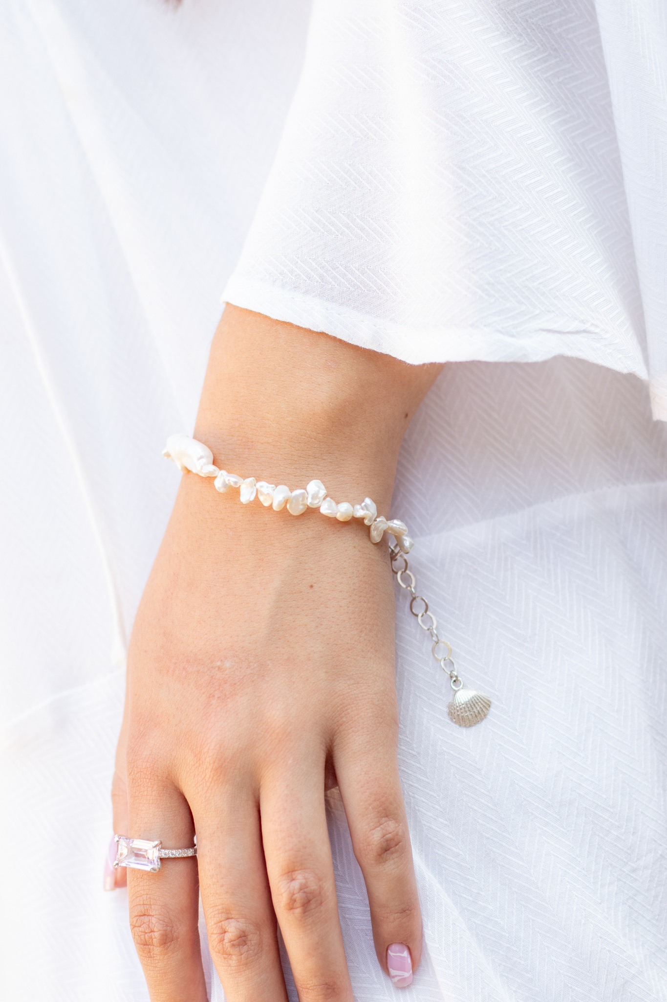 צמיד חרוזי פנינה פראית, בעל סיומת מכסף 925 ושרשרת הארכה בתוספת עיטור עשוי מכסף.