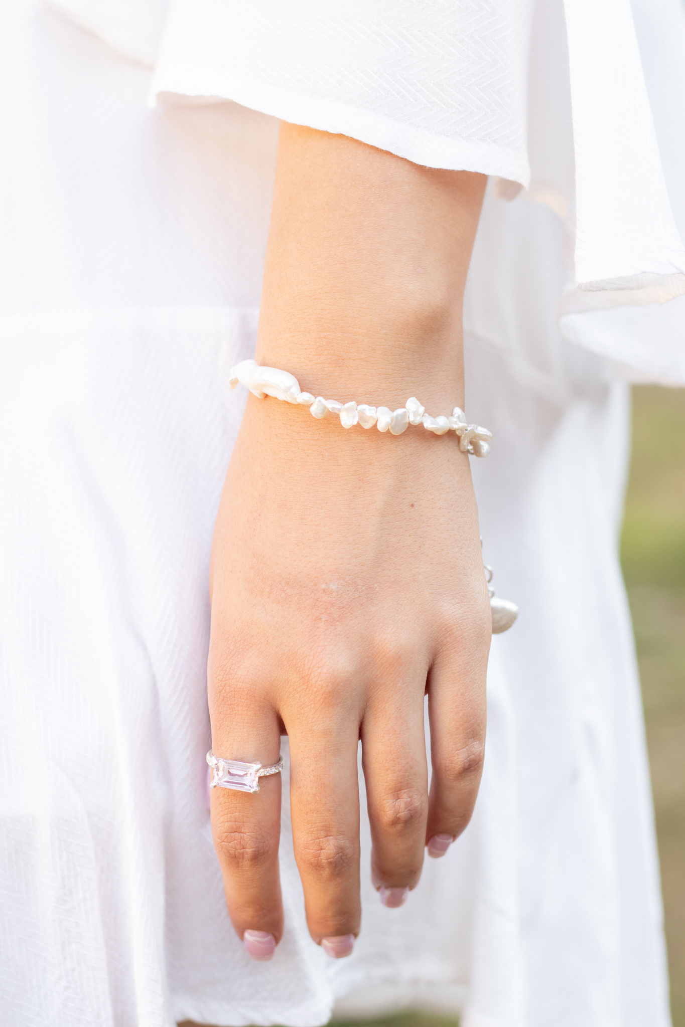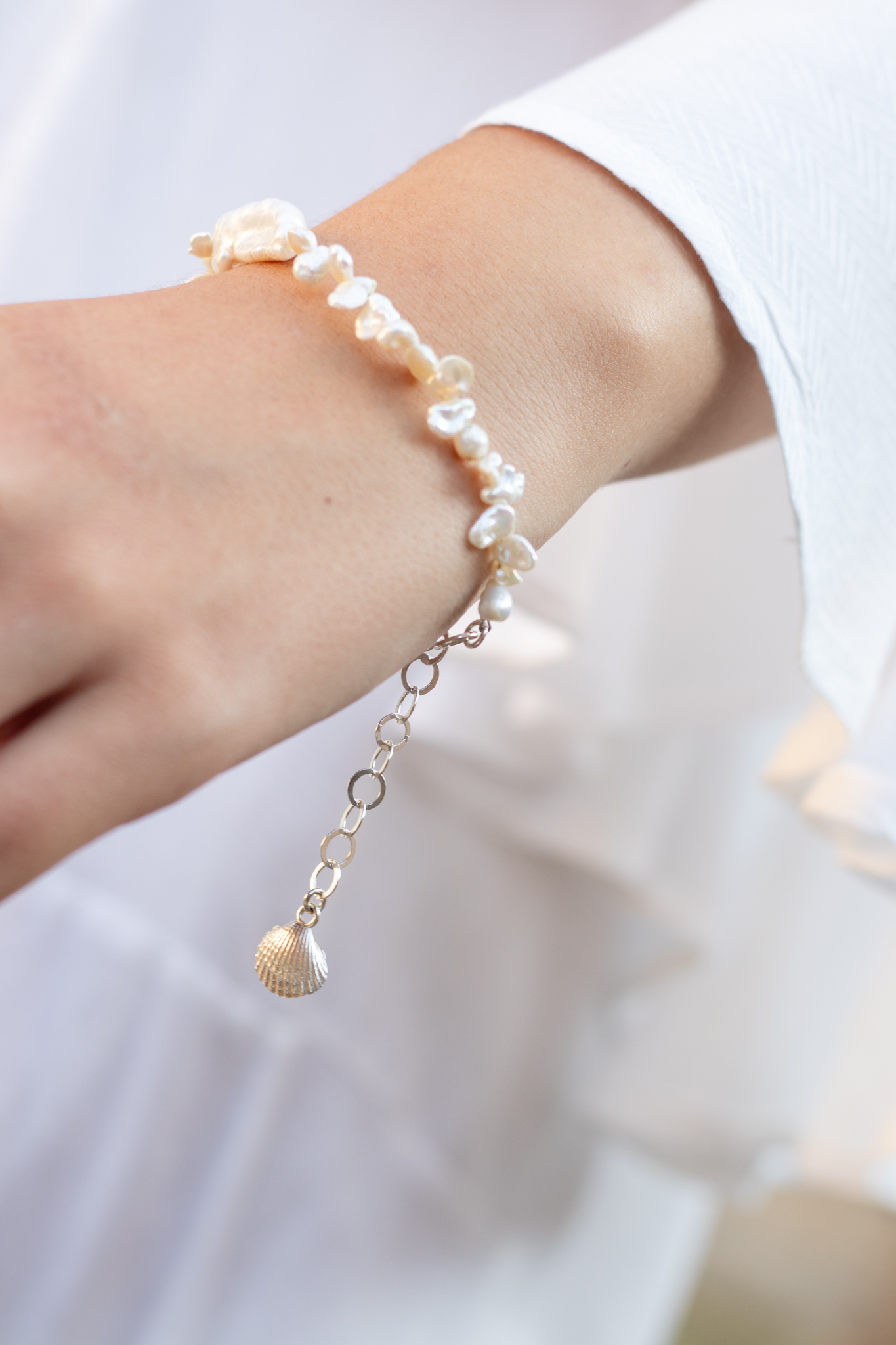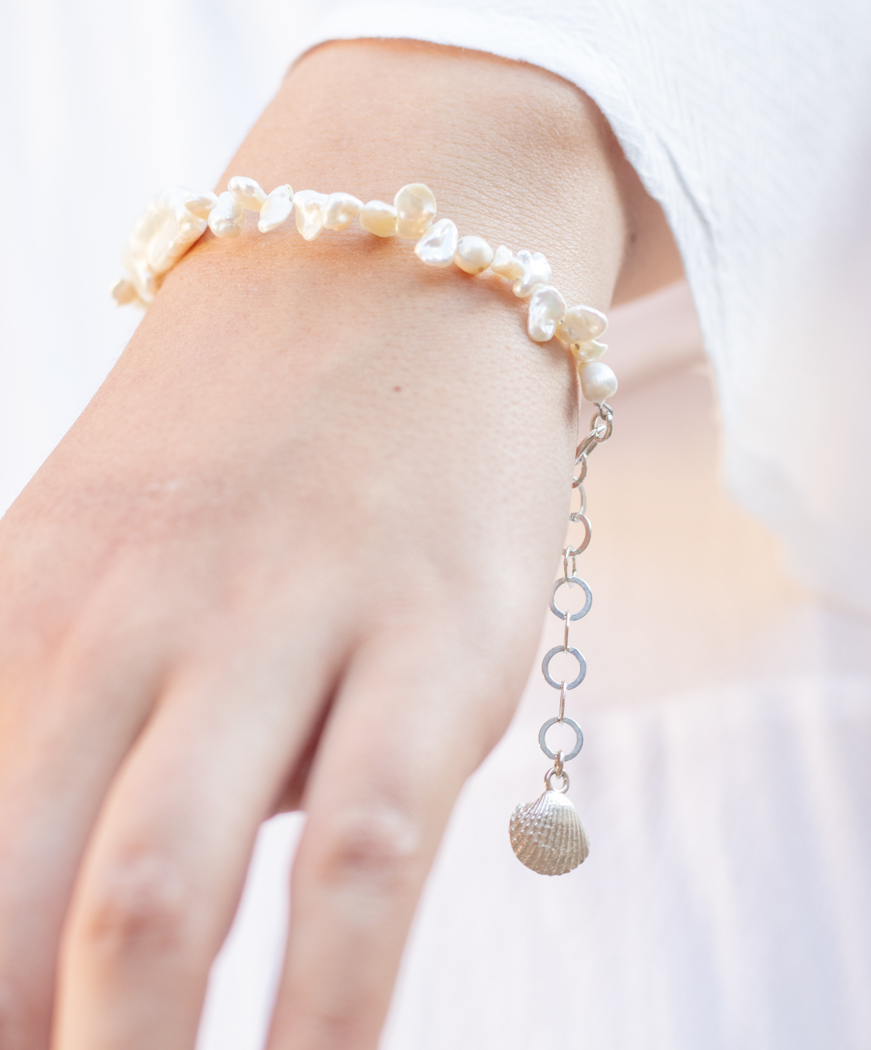 צמיד חרוזי פנינה פראית, בעל סיומת מכסף 925 ושרשרת הארכה בתוספת עיטור עשוי מכסף.