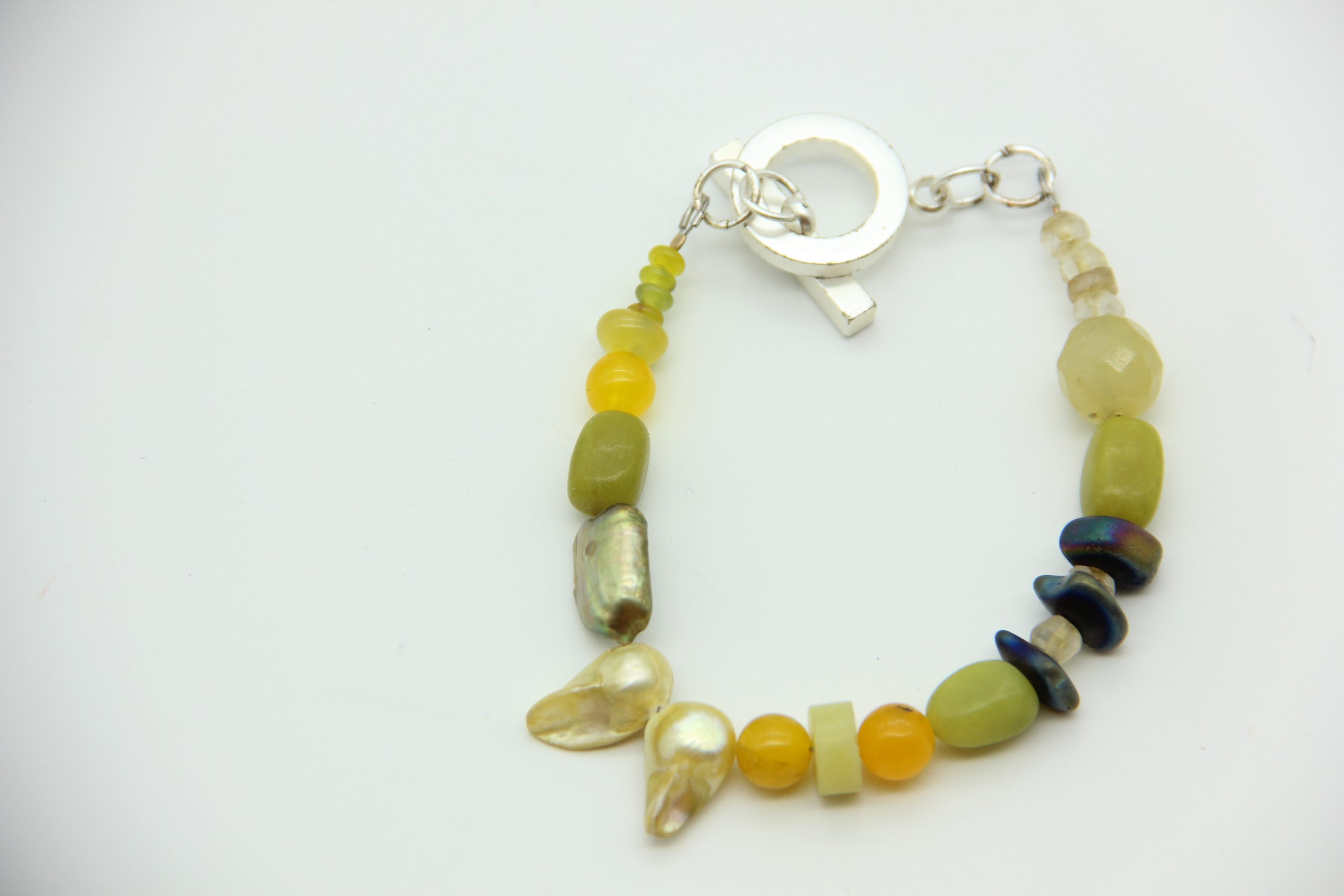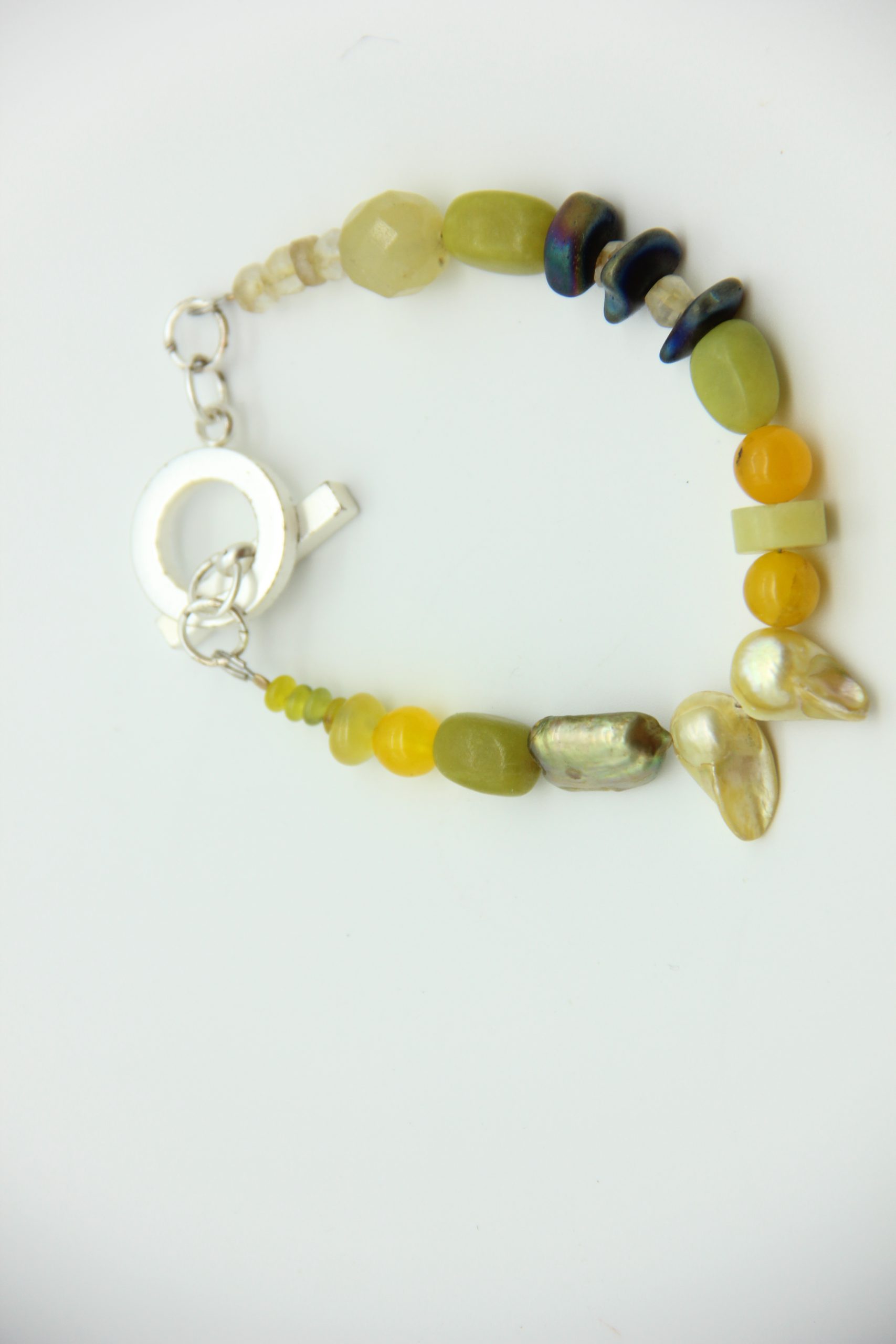 צמיד שזור בפנינים פראיות ואבני חן מסוגים שונים, בשילוב שרשרת כסף 925 וסוגר בציפוי זהב 18 קאראט.