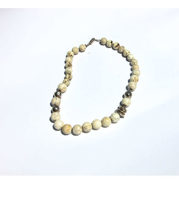 שרשרת כסף עם אבנים טבעיות בגוון שמנת עם גווני חום ואפקט עתיק, בשילוב חרוזי כסף בצורות שונות.