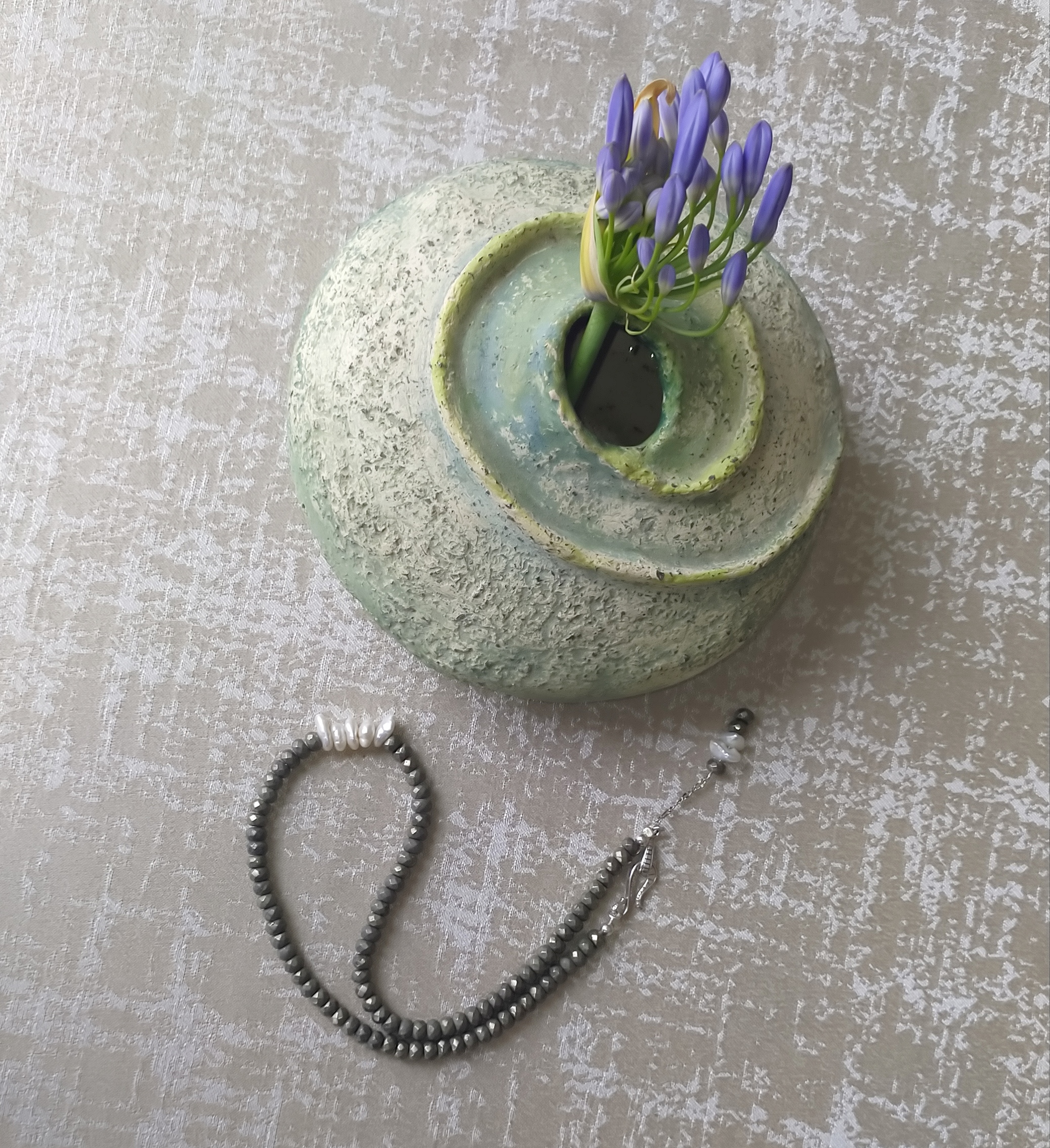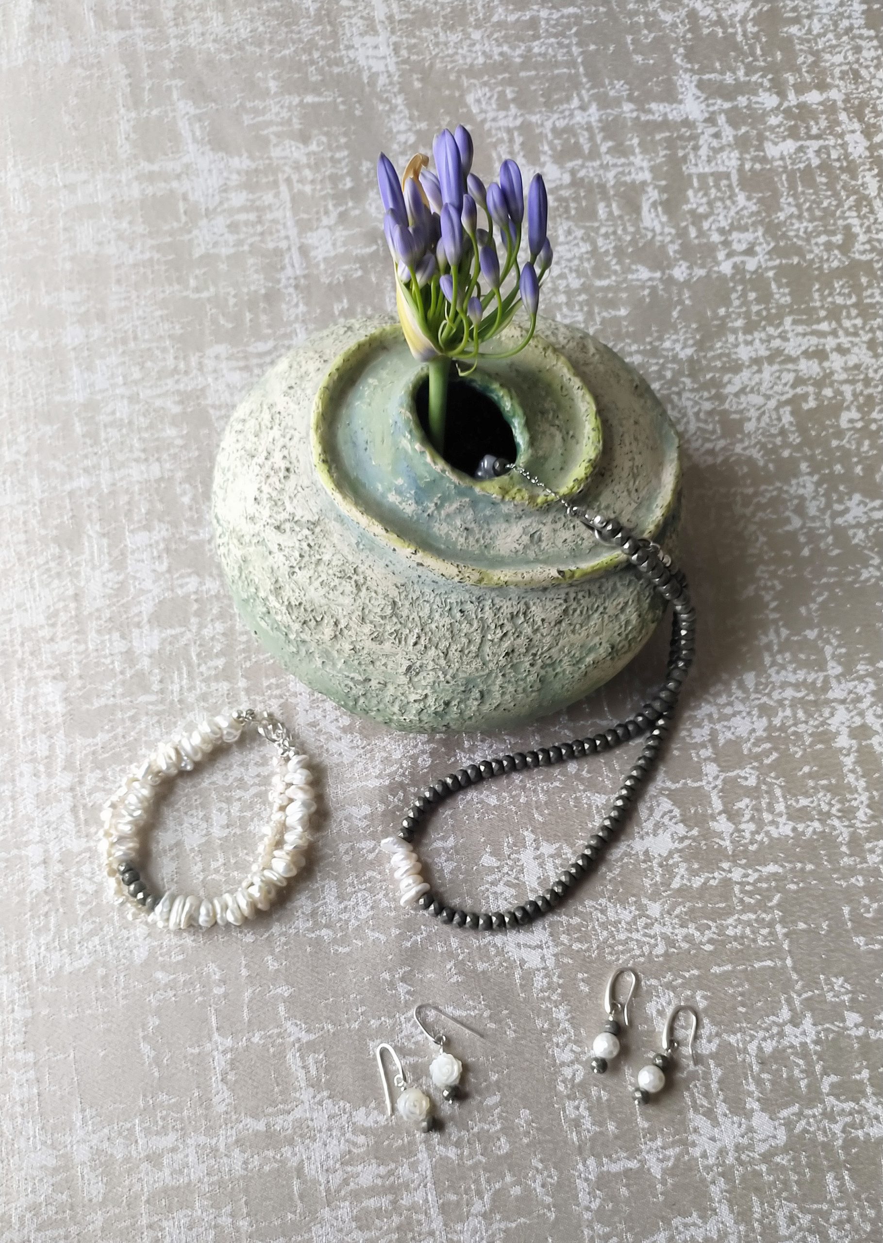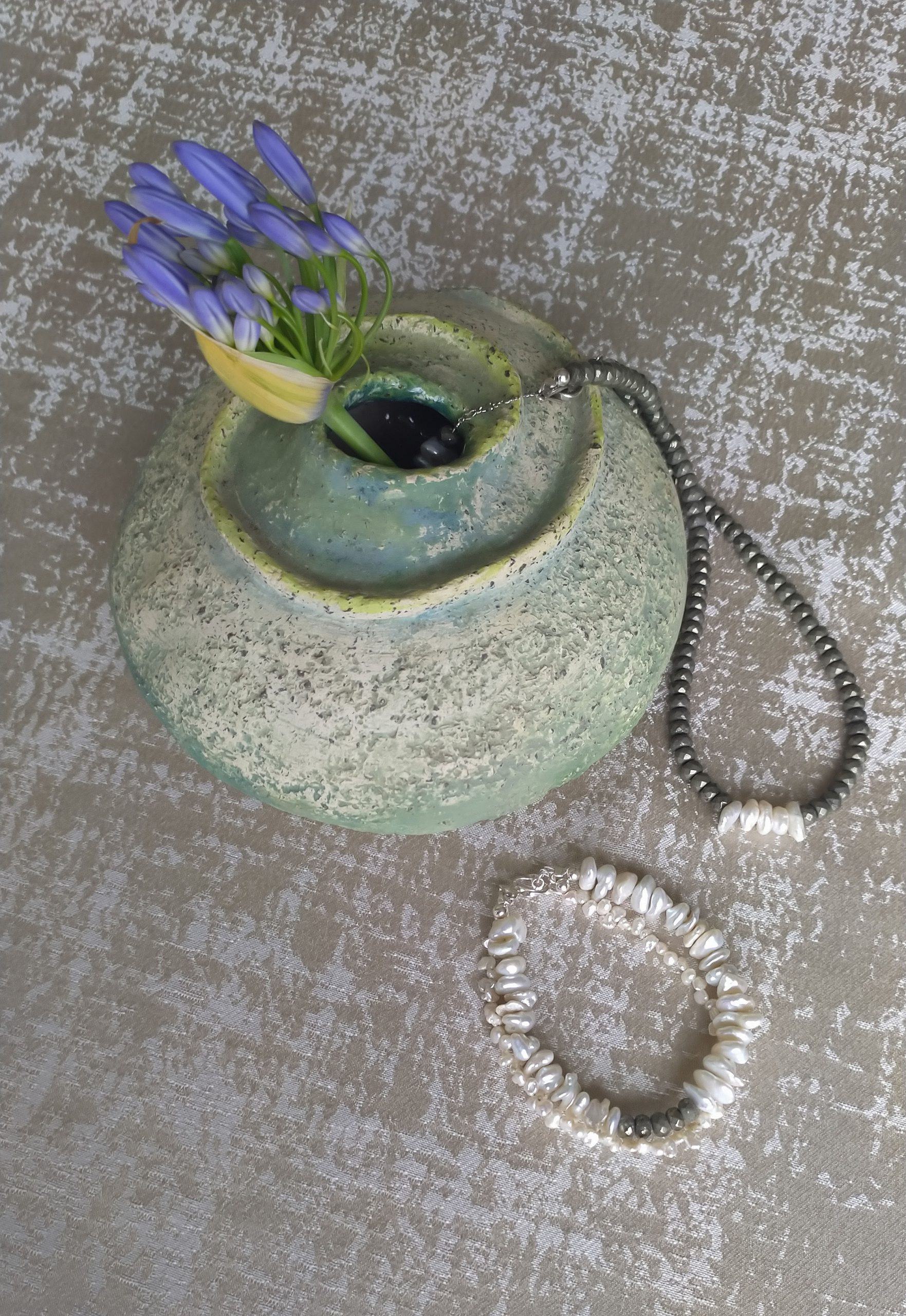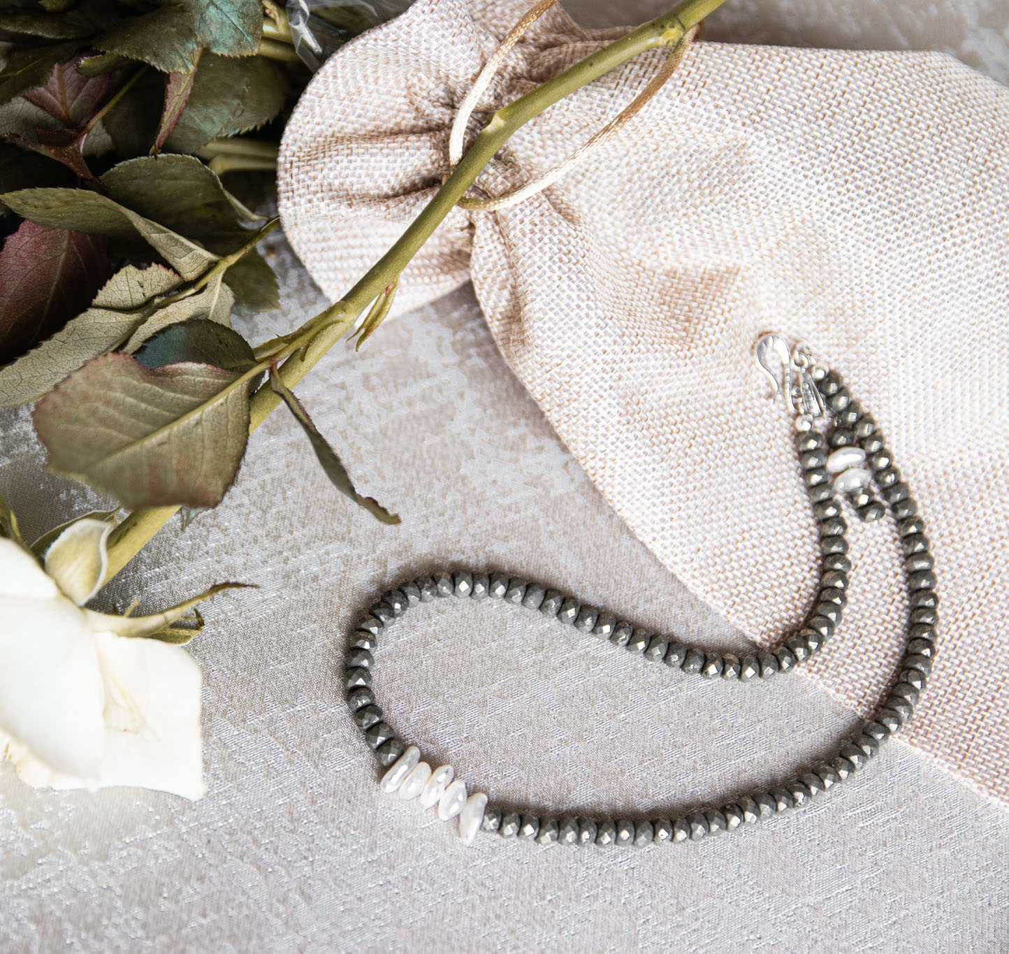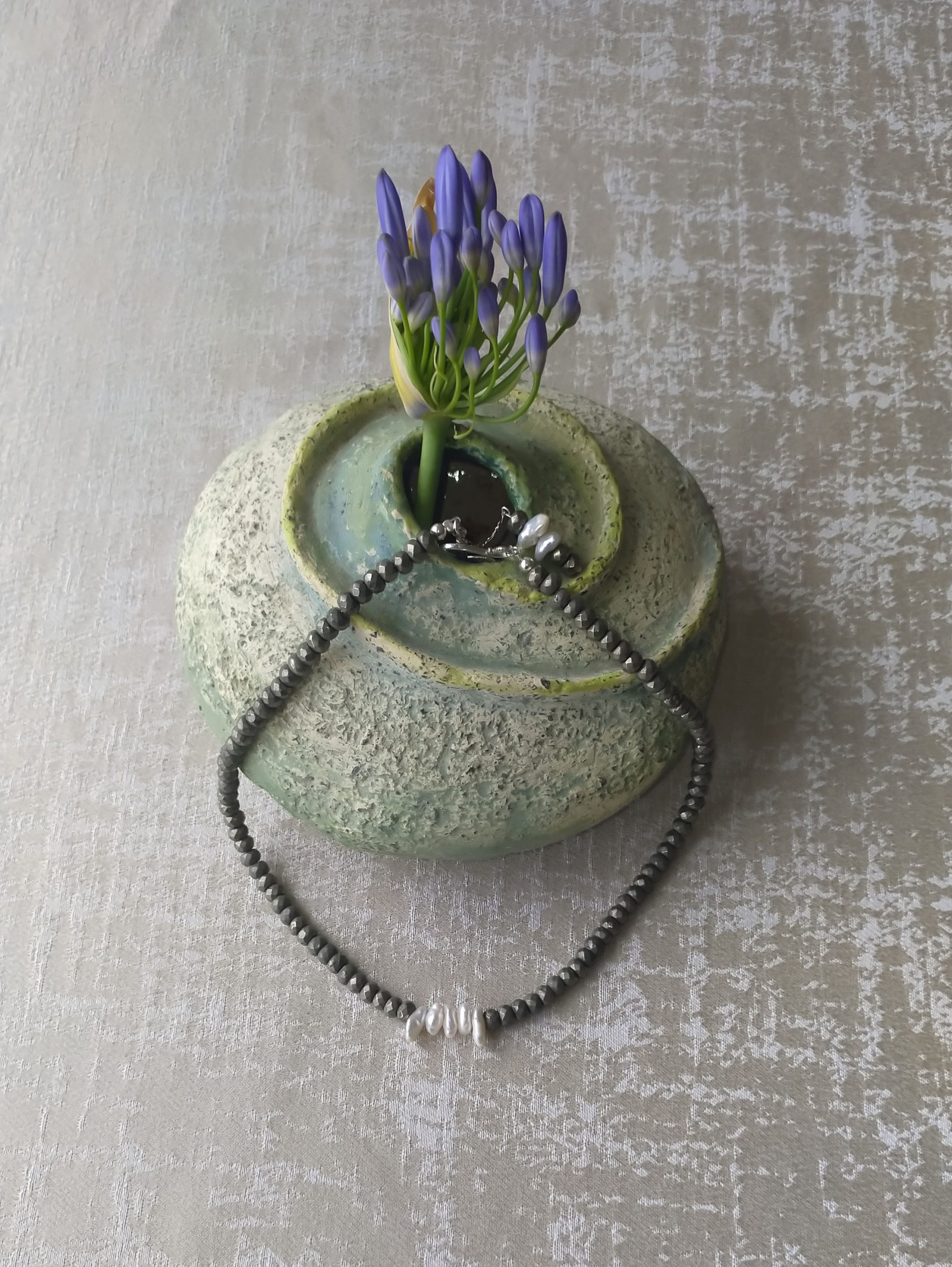 שרשרת אבני פירית ובמרכזה פנינים פראיות, עם סוגר דקורטיבי מכסף.