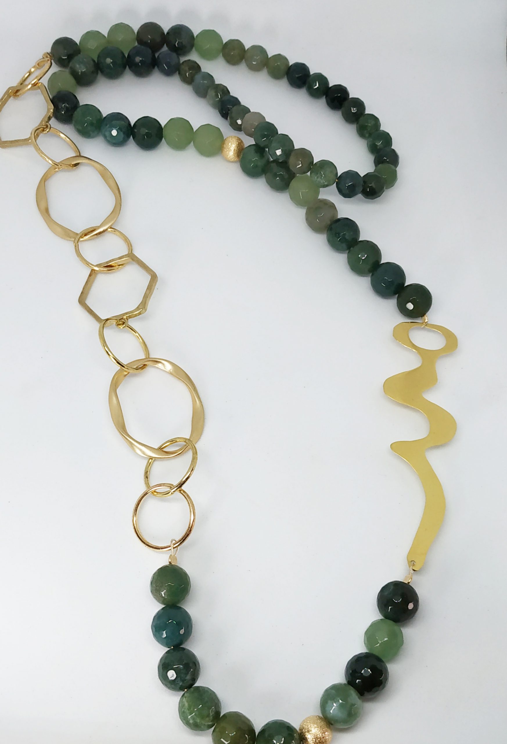 שרשרת אבני מוס אגט עגולות בגווני ירוק בתוספת אלמנט דמוי נחש בציפוי זהב 18 קאראט.
