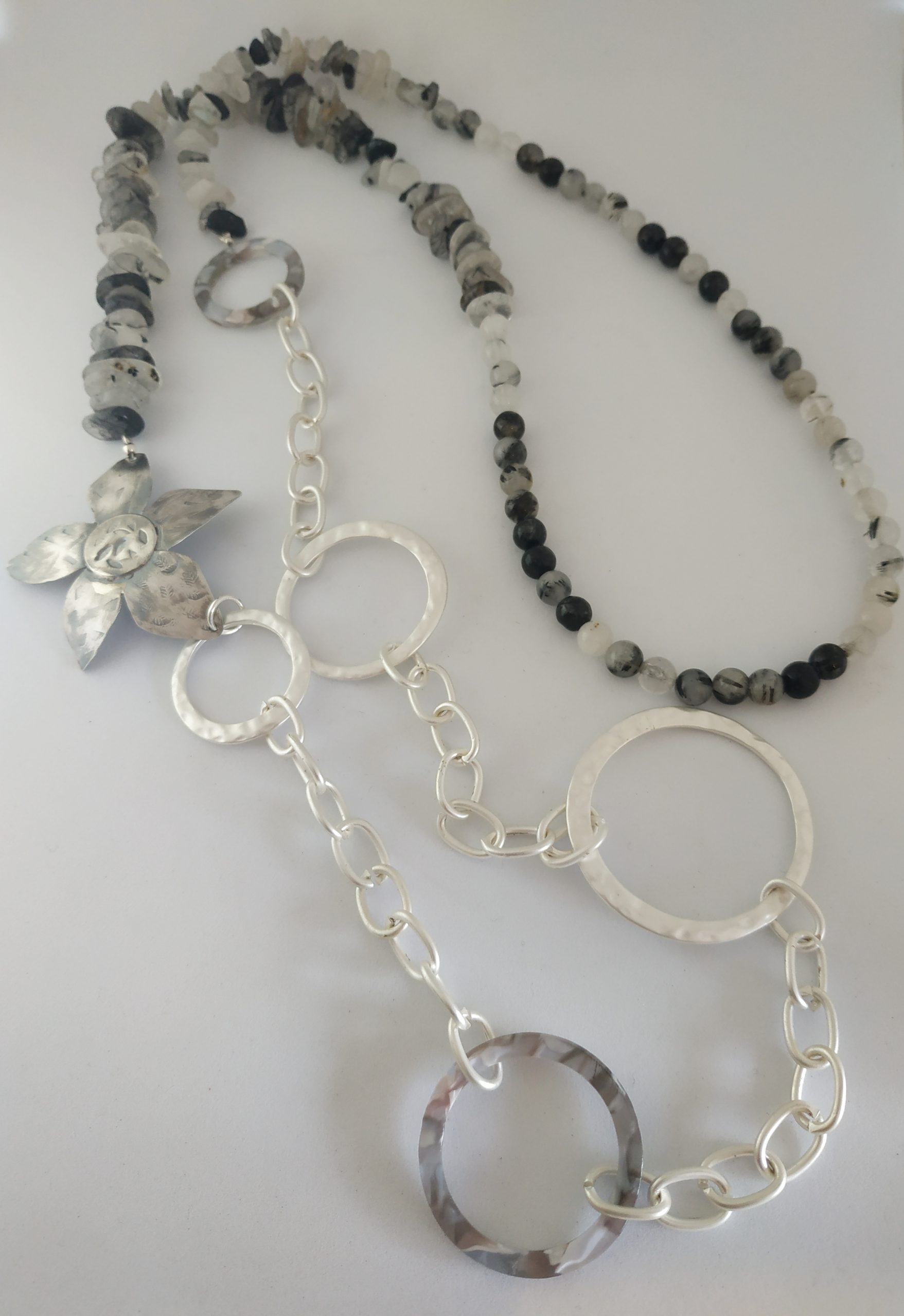 שרשרת אבני רוטיל קווארץ שחור, בצורות וטקסטורות מגוונות.