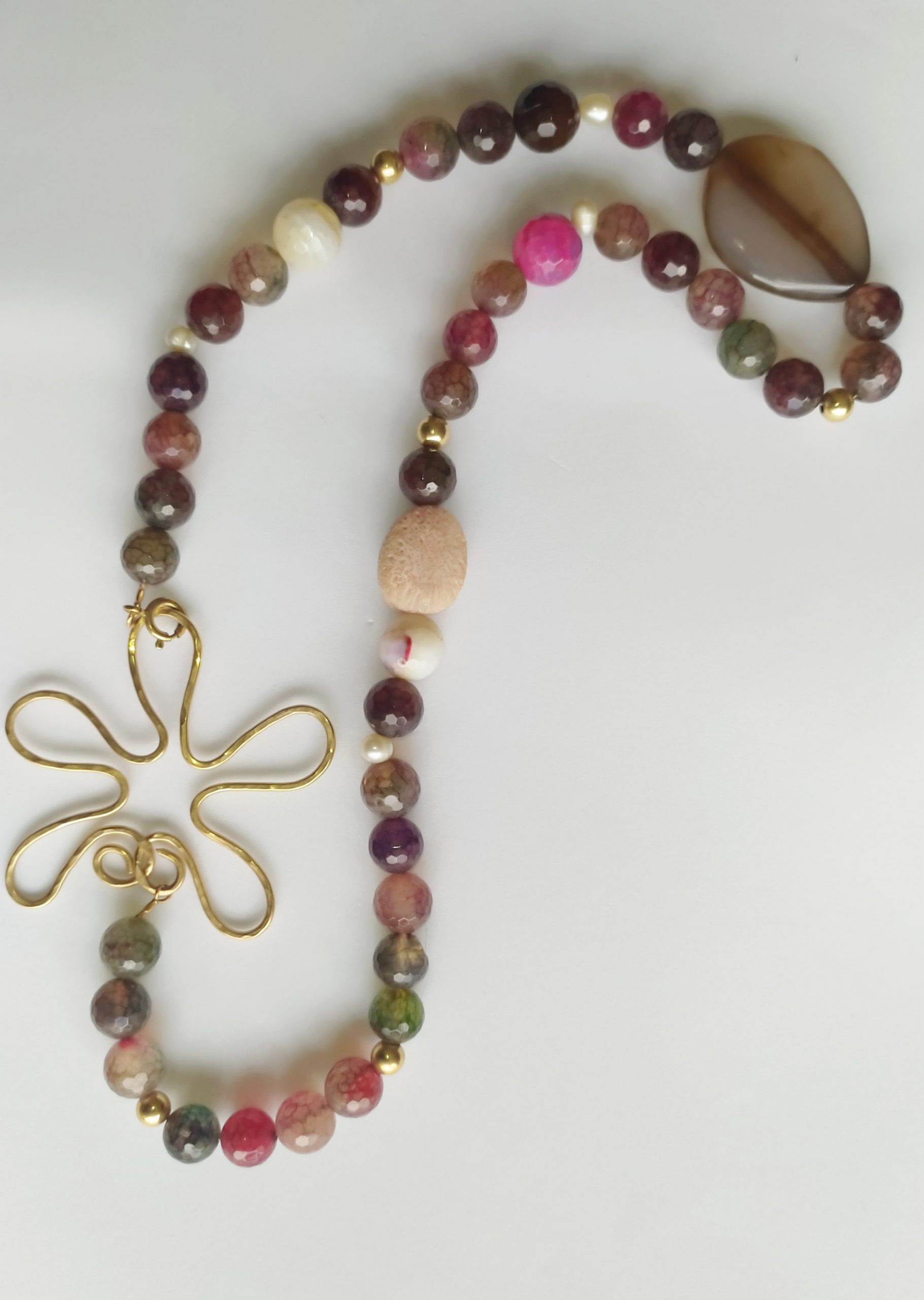 שרשרת אבני אגט צבעוניות ובתוכם משתלבות אבני חן נוספות. את השרשרת מעטר פרח עשוי גולדפילד המשמש כסוגר דקורטיבי